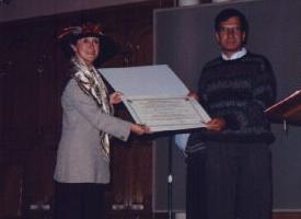 C'est la fierté au coeur que nous écoutons l'hommage qu'avait préparé Sara Louthoud pour son grand-père, Joseph Perron, et dont la version française est lue par Lina Perron, et la version anglaise par notre présidente, étant donné l'absence de madame Louthoud retenue à la maison par la maladie. Monsieur Gaston Dallaire, représentant de l'Abitibi-Price, nous fait part des diverses étapes qu'a encourues la réalisation de cette plaque dont le produit final est l'oeuvre d'un artiste de la région.