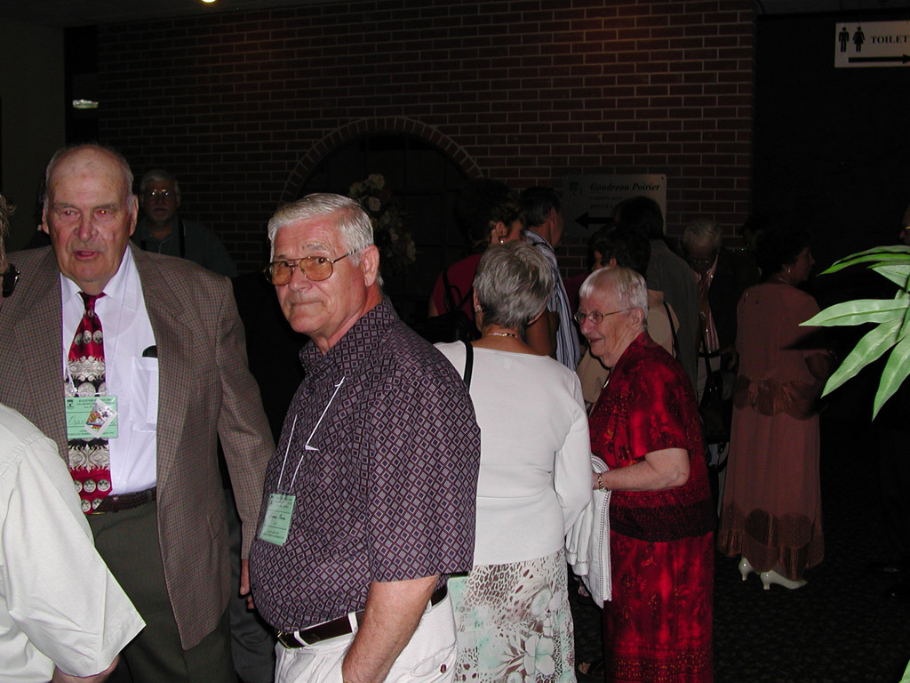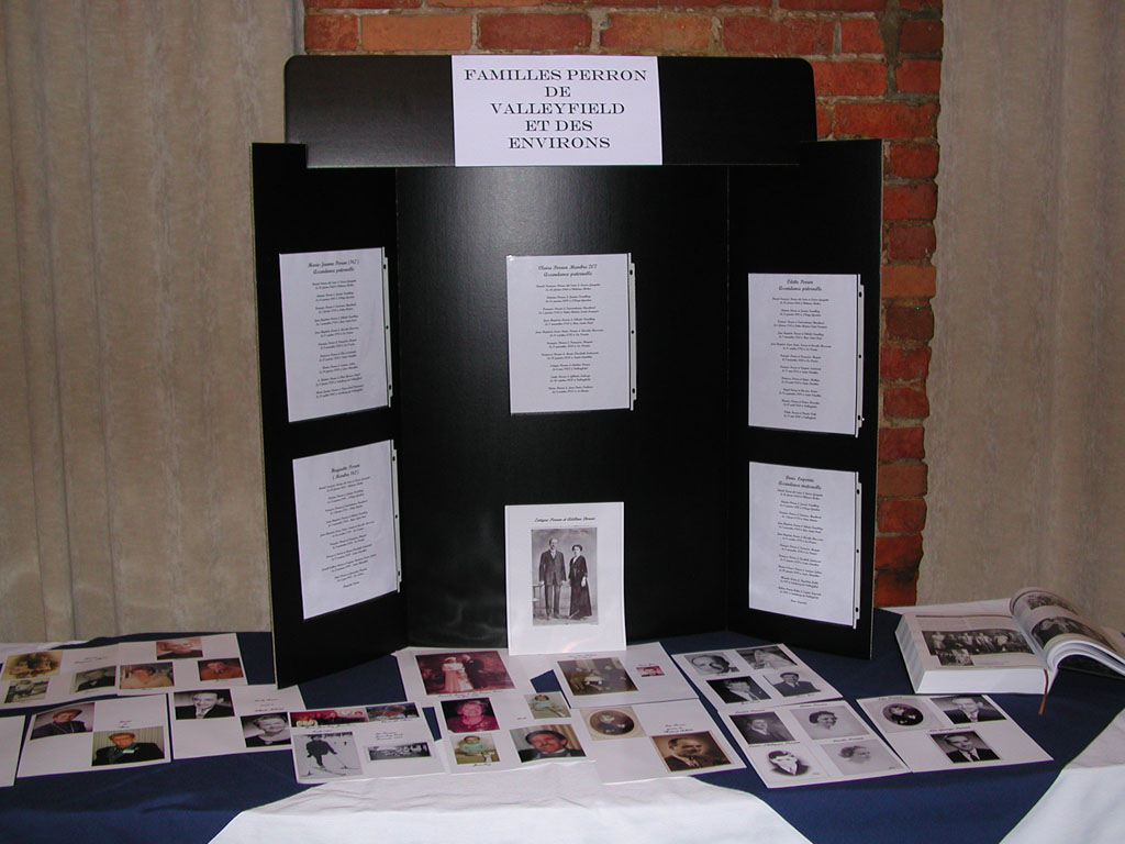 Dès leur entrée au Salon Empire, les gens commencèrent à visiter l’exposition élaborée par des membres de l’Association sous le thème « Autour de notre patrimoine ». Le long des murs tout autour de la salle, dix longues tables couvertes de photos et de documents parlaient des ancêtres. Il est toujours agréable de voir des photos et objets du passé. M. René Péron avait apporté de nombreuses bibles anciennes, des recueils de cantiques et de musique du passé et des photos de meubles venant de ses aïeuls et qui font l’orgueil de sa famille. Par les présentoirs de George et de Gaby, nous faisions connaissance avec leur lignée respective, tous deux étant de souche Suire, tandis que la souche Dugrenier dit Perron exposait des objets, photos et documents venant de Cécile, Pierre et Normand, et la souche Desnoyers des articles fournis par Rhéal. « Autour de notre patrimoine » nous rappelait ces grandes maisons et ces familles nombreuses qui, malgré le peu de commodités qu’elles avaient, comparé à aujourd’hui, exprimaient le bonheur et la joie de vivre.