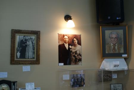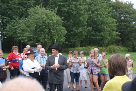 Bien avant le buffet du midi, madame Bertha Perron, qui était en charge du volet histoire, commente, avec vivacité, une présentation visuelle sur les familles Perron pionnières du village et leur rôle dans la communauté; elle décrit aussi les armoiries de la municipalité. Aussi à l’honneur, les différentes entreprises Perron de l’endroit et des environs. Ce visuel allait se dérouler sur écran durant tout le souper. Mme Johanne Gonthier, députée de Mégantic-Compton, fait une brève visite pour offrir ses vœux aux participants. C’est au moment du tour guidé qu’une belle surprise nous attend: des ‘acteurs’ en costume du début des années 1900 racontent la petite histoire des Perron et régalent les gens d’anecdotes amusantes.