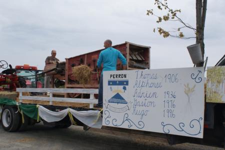 Après avoir visité les principaux sites du village, nous nous dirigeons vers la campagne et plus particulièrement vers le Rang 10 qui s’appelle maintenant Chemin des Perron en l’honneur des nombreux Perron de Saint-Isidore et particulièrement ceux qui ont développé ce rang. Le groupe s’arrête à la ferme de Gaston Perron et de son fils Hugo. À cet endroit nous avons l’opportunité d’assister à une démonstration de battage de grain avec une batteuse stationnaire datant de 1925, et d’une ancienne presse à foin.