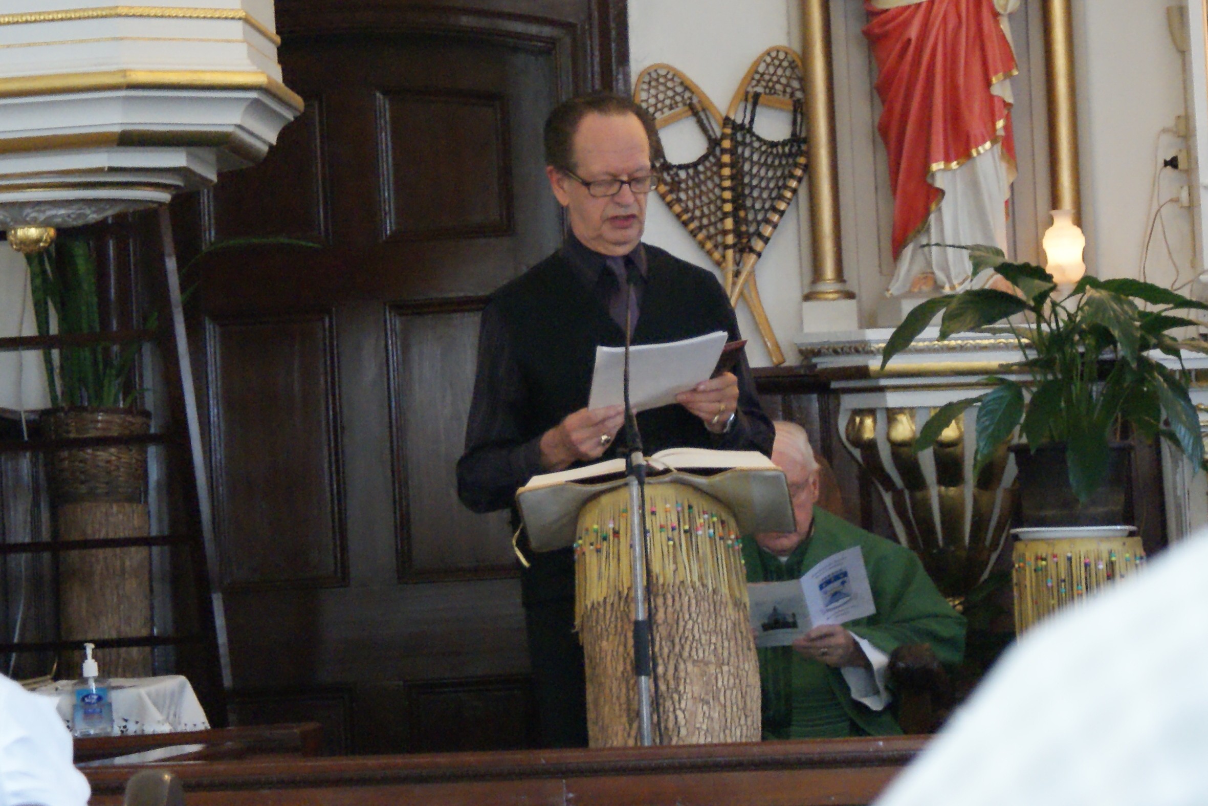 Suivant l’homélie prononcée par le curé Paradis, madame Claudette Côté, s’accompagnant au tambour, interprète un chant à la Vierge, intitulé On oue ho ton dio. C’est particulièrement pour honorer le 50e anniversaire de prêtrise de l’abbé Évariste que madame Côté chante ce beau cantique huron.