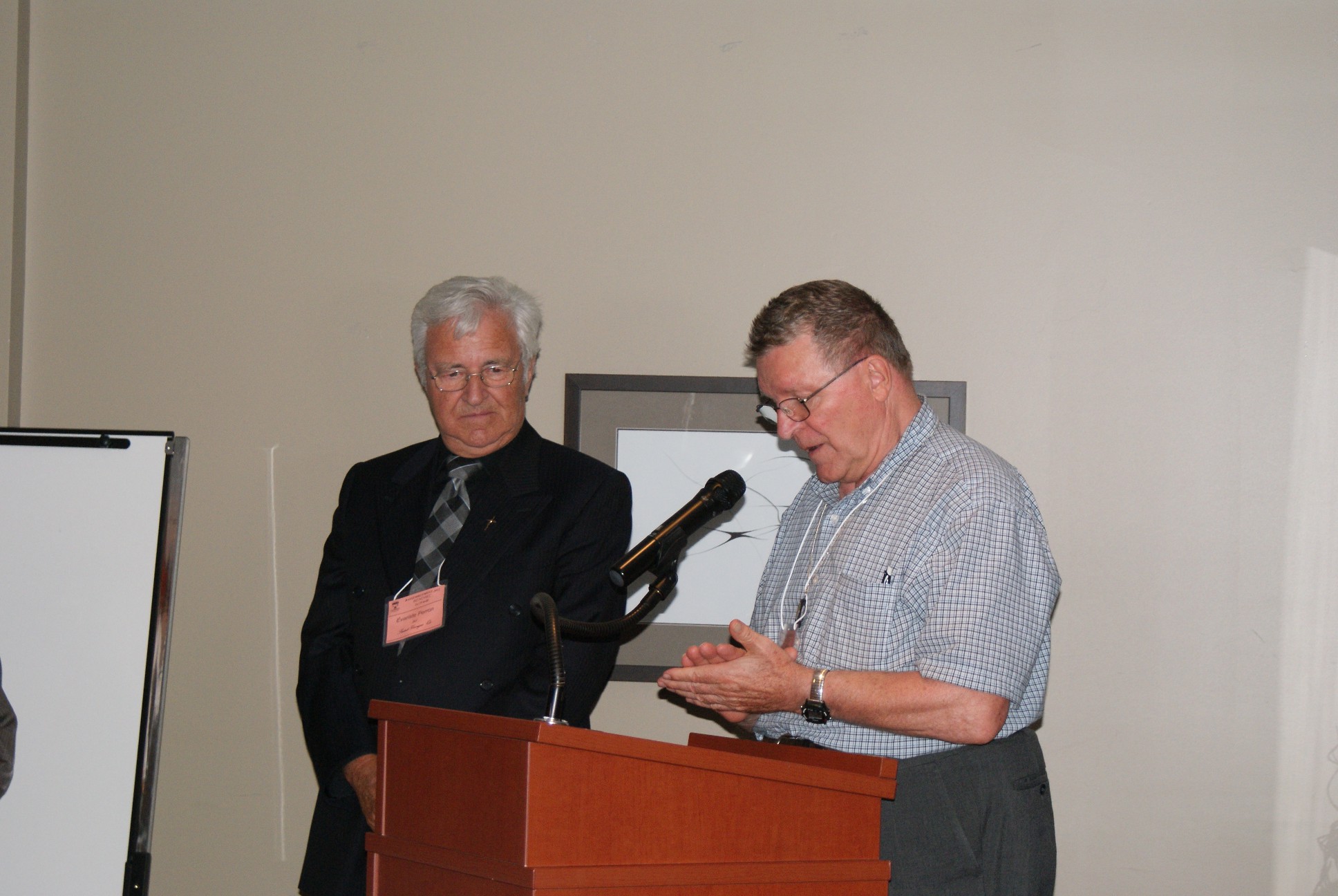 Les convives dégustent l’entrée et le potage avant que ne commence l’animation. Fernand annonce que c’est le temps des hommages et donne la parole à la présidente. Manon invite l’abbé Évariste Perron à venir sur la scène de même que M. Simon Perron qui fait la présentation de son frère. C’est Suzanne, sa cousine, qui présente la gerbe de fleurs à Évariste tandis que Manon lit le texte du parchemin avant de le remettre au jubilaire. Applaudissements de la foule et nombreuses photos… Évariste est bien connu des membres de l’Association qui suivent régulièrement les rassemblements Perron et ces derniers sont heureux de le fêter.